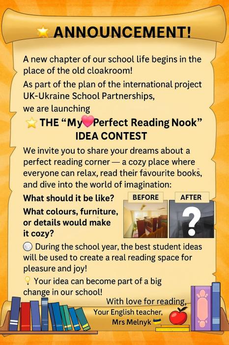 Êîíêóðñ ³äåé "My perfect reading nook" â ðàìêàõ UK-Ukraine School Partnerships